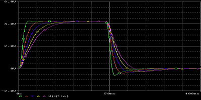 下圖顯示了一個(gè)50歐姆電阻與脈沖電壓源(V1)串聯(lián)以提供源端接的瞬態(tài)分析結(jié)果。這顯著抑制了上升沿的振蕩,并使瞬態(tài)響應(yīng)受到嚴(yán)重抑制。在下降沿,仍然存在一些下沖。