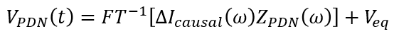 對于上圖中的模擬信號,帶寬非常窄,并且不與任何PDN諧振重疊。由模擬組件在該帶寬內(nèi)吸收模擬信號而產(chǎn)生的任何瞬變都不會產(chǎn)生明顯的紋波,并且會在電壓容限范圍內(nèi)工作。無論您是使用數(shù)字信號還是模擬信號,PDN都可以看作是濾波器,對從電源汲取的電流信號起作用。對于模擬信號和數(shù)字信號,時域中的電壓波動都可以使用傅立葉逆變換簡單地計算出來: